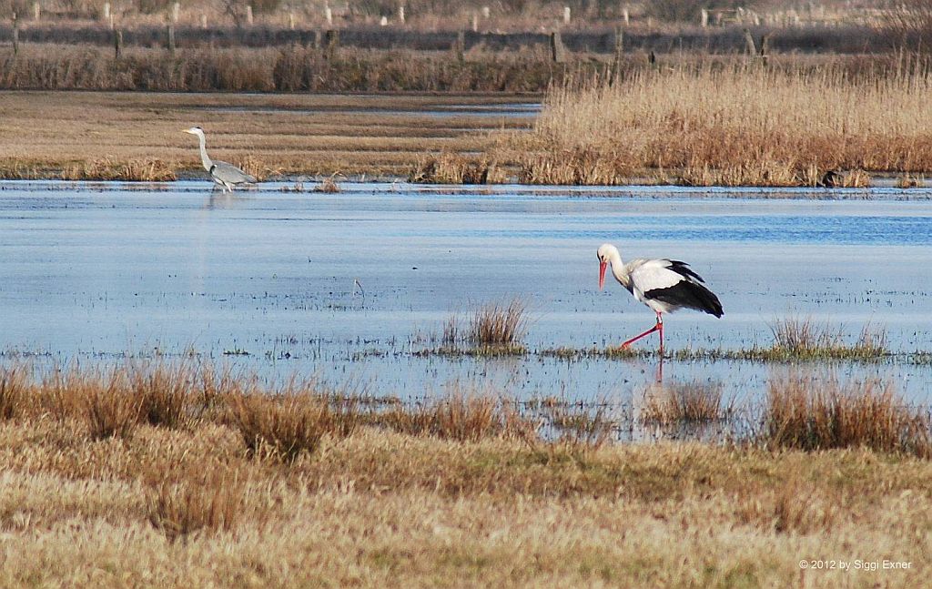 Hauptnahrungsgebiet ist das wiedervernässte Ochsenmoor. Im Hintergrund ein Graureiher.